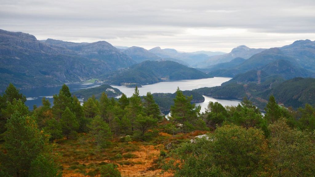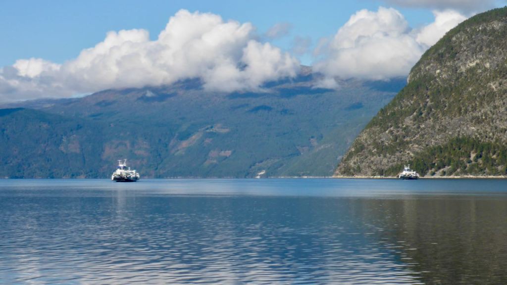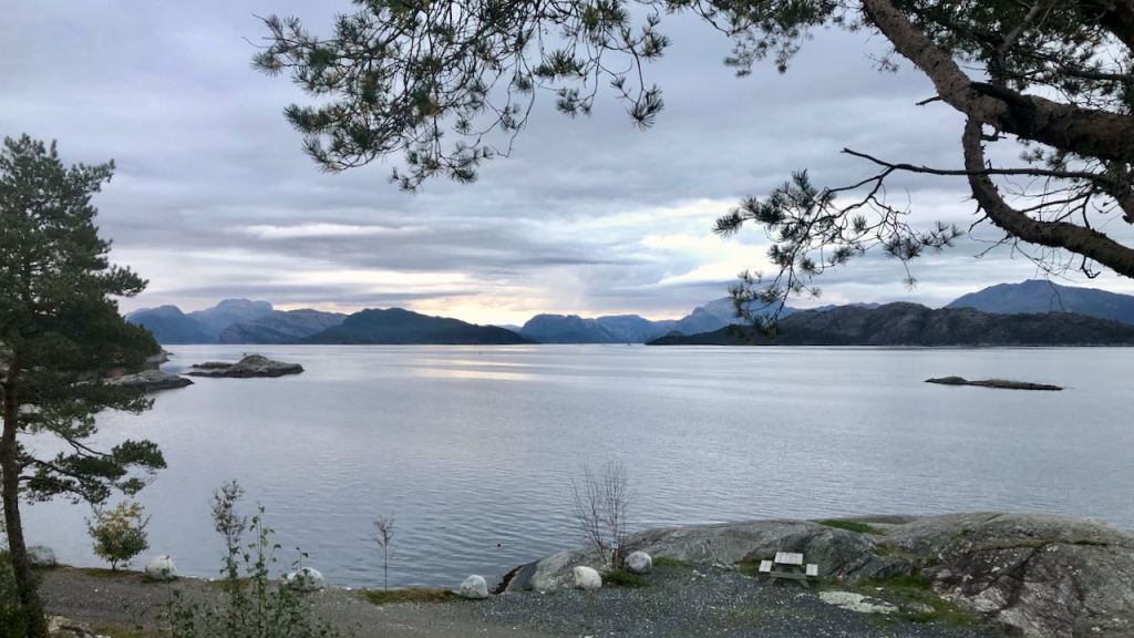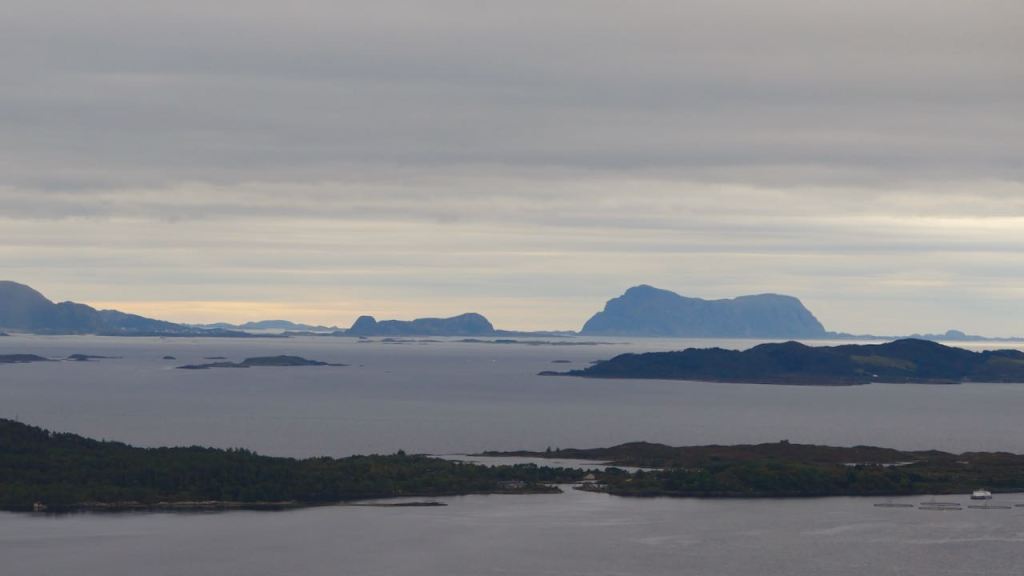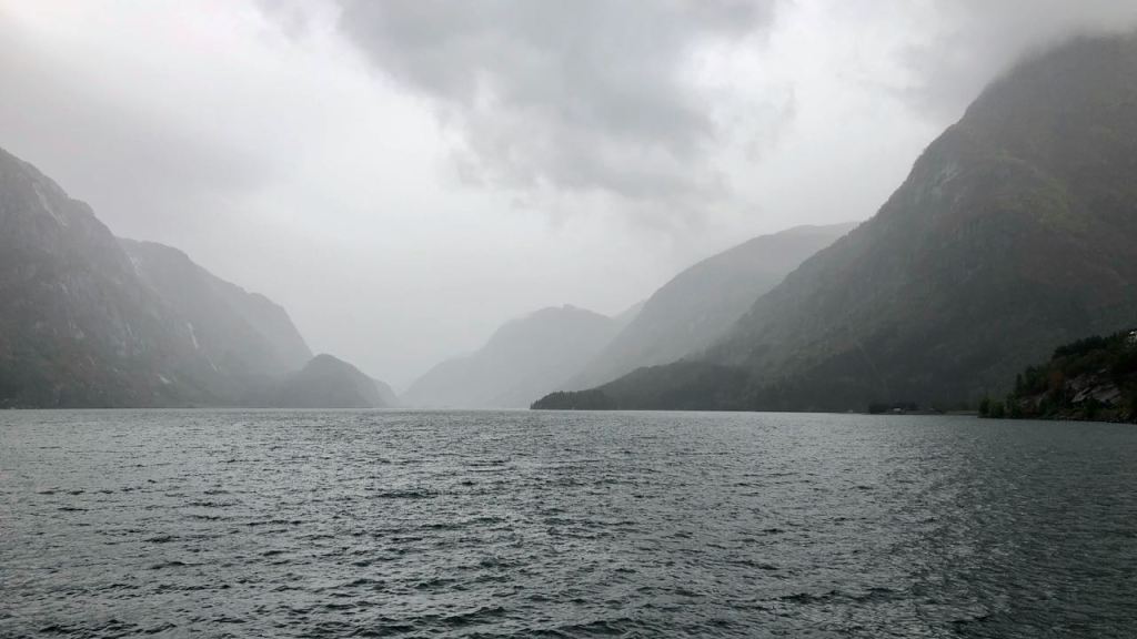 Die dann folgende Fahrt auf der Nordseite des Sognefjords fällt wieder deutlich regenreicher aus, die Berghänge verschwinden in einer Nebelschicht. Aber schon die beiden folgenden Tage in der Gegend von Leirvik, wo sich der Fjord zum Meer hin öffnet zeigt sich das Wetter wieder von der sonnigeren Seite.