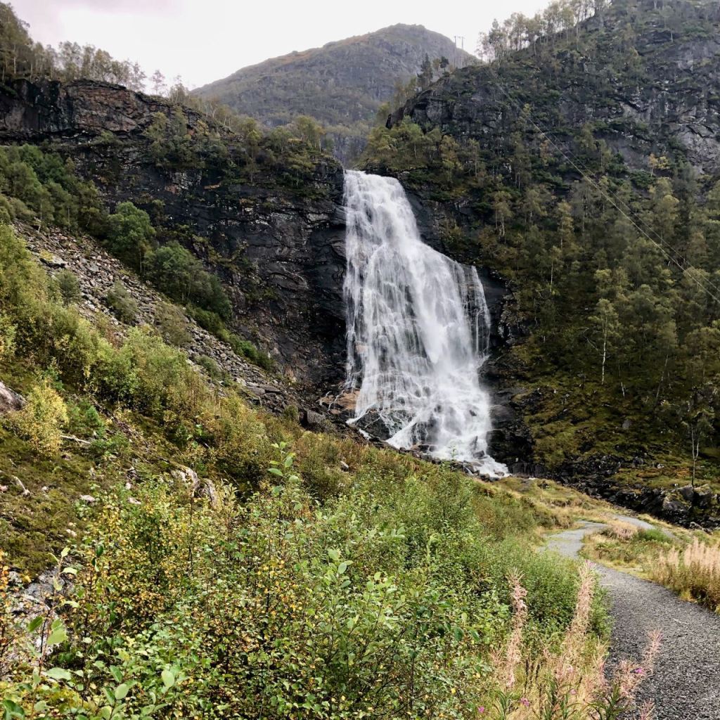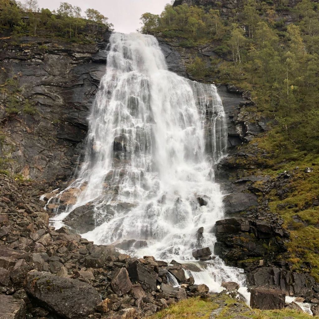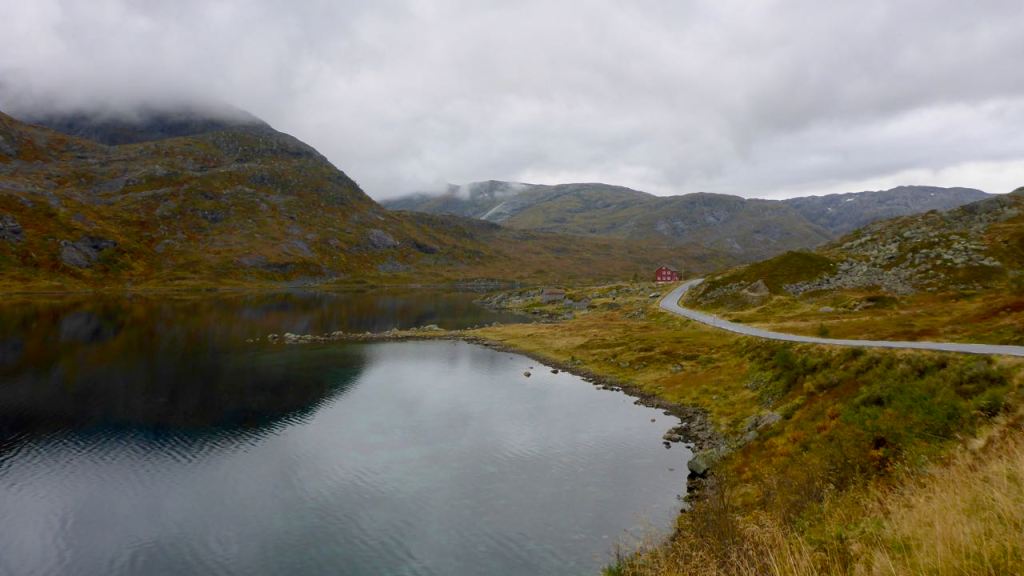 Dem See Sandvinvatnet folgend mit eindrücklichen Berghängen an den Wasserfällen Låtefossen, Wasser überall, bis hinauf in die Pässe herrscht Regen vor, irgend wann geht dieser dann in nassen Schnee über. Erst in wieder tieferen Lagen hellt sich der Himmel etwas auf, so dass wir in Bø einen trockenen Abend erleben.