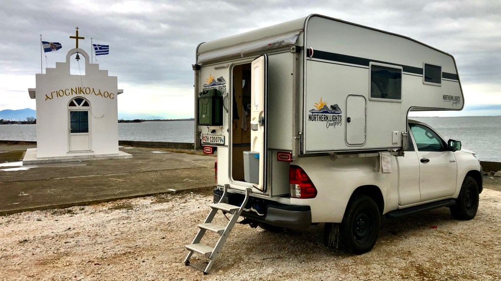 Weiter geht dann unsere Reise in Richtung Thessaloniki. Kurz davor finden wir einen schönen Übernachtungsplatz bei einer Kapelle zuvorderst bei den Fischern auf dem Axios Delta. Da es Sonntagabend vor dem Rosenmontag, dem letzten Tag vor der Orthodoxen Fastenzeit ist, wird diese Kapelle an diesem Abend noch mehrfach angefahren für ein kurzes Gebet.