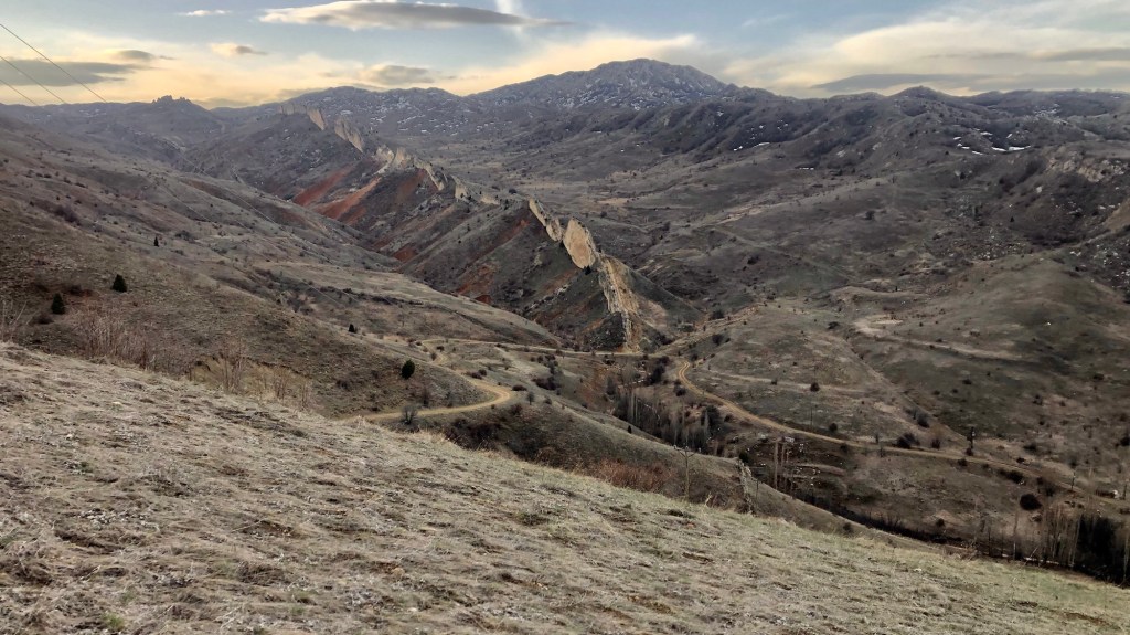 Etwas vor Sivas, südlich von Imrandli suchten wir in spektakulärer Landschaft nach einem Übernachtungsplatz, die Wetterprognosen sprachen von Sturm, die Spuren auf der schon lange nicht mehr befahrenen Strasse von Bären und der zu erwartende Niederschlag sprach gegen ein Verbleib im engen Tal.