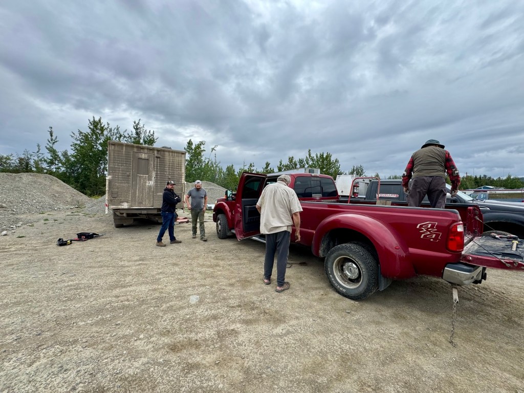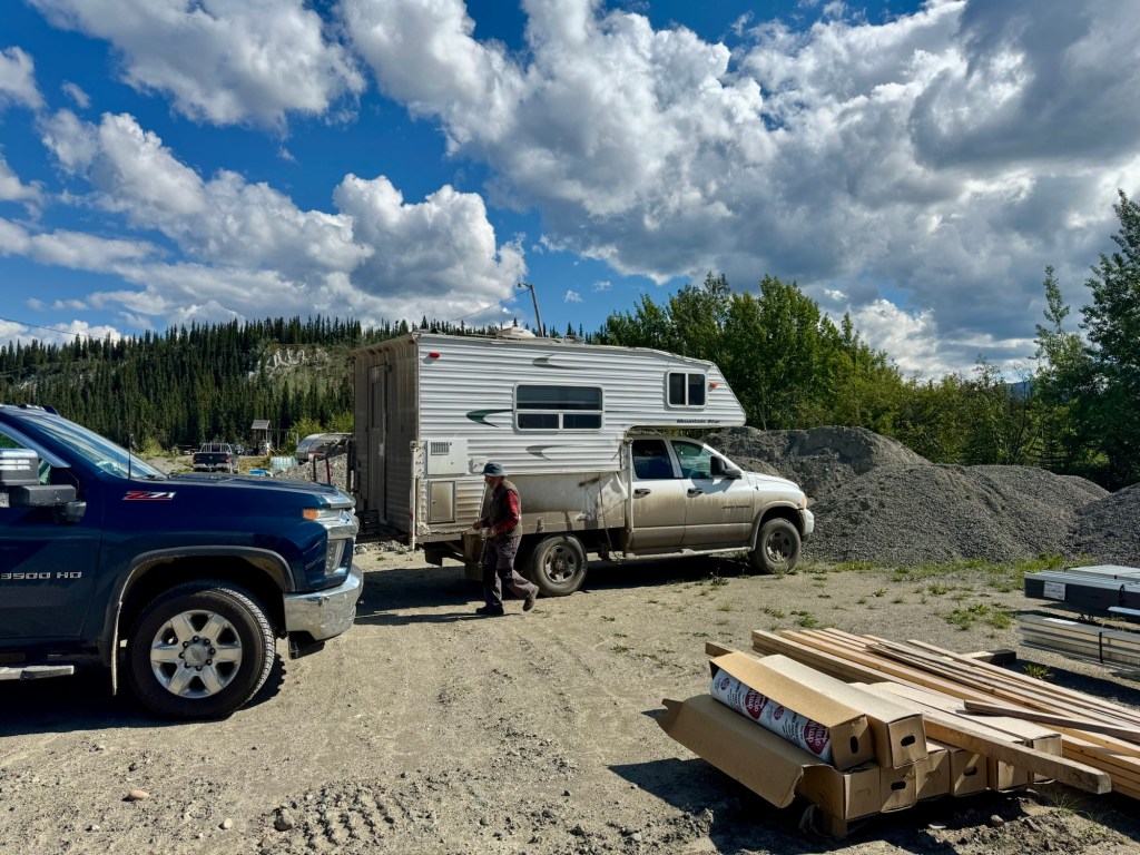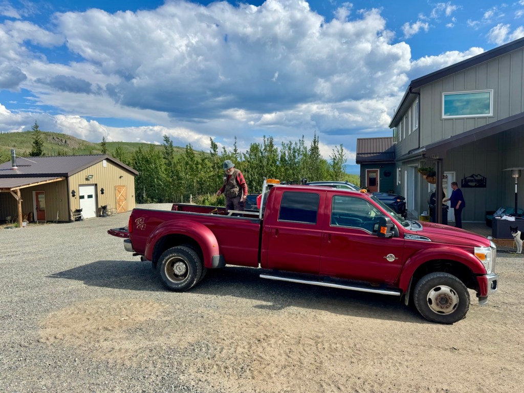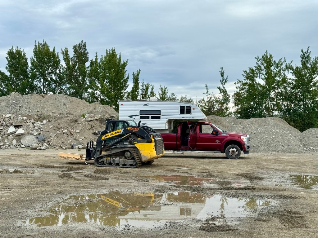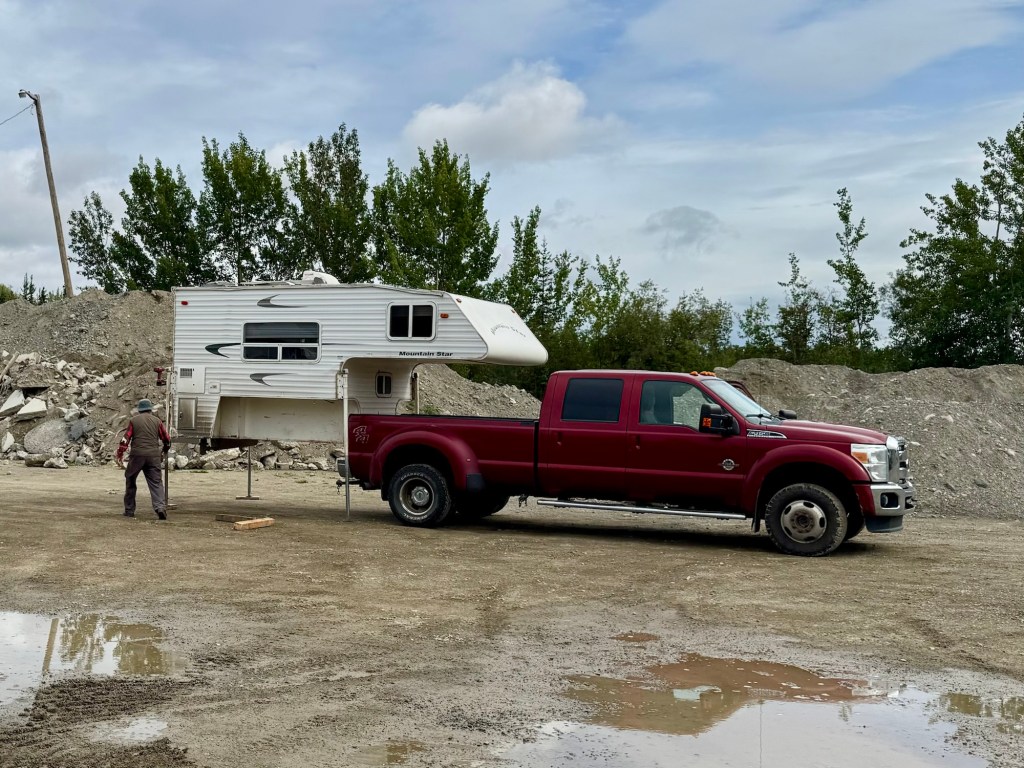 Nun das ist aber die Rechnung ohne den Wirt, d.h. ohne John gemacht. John und Lisa sind nun ja wieder unsere Gastgeber und da steht doch noch ein Ford F450, noch als Zugfahrzeug vor einem Tieflader mit Container.