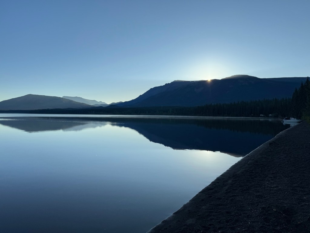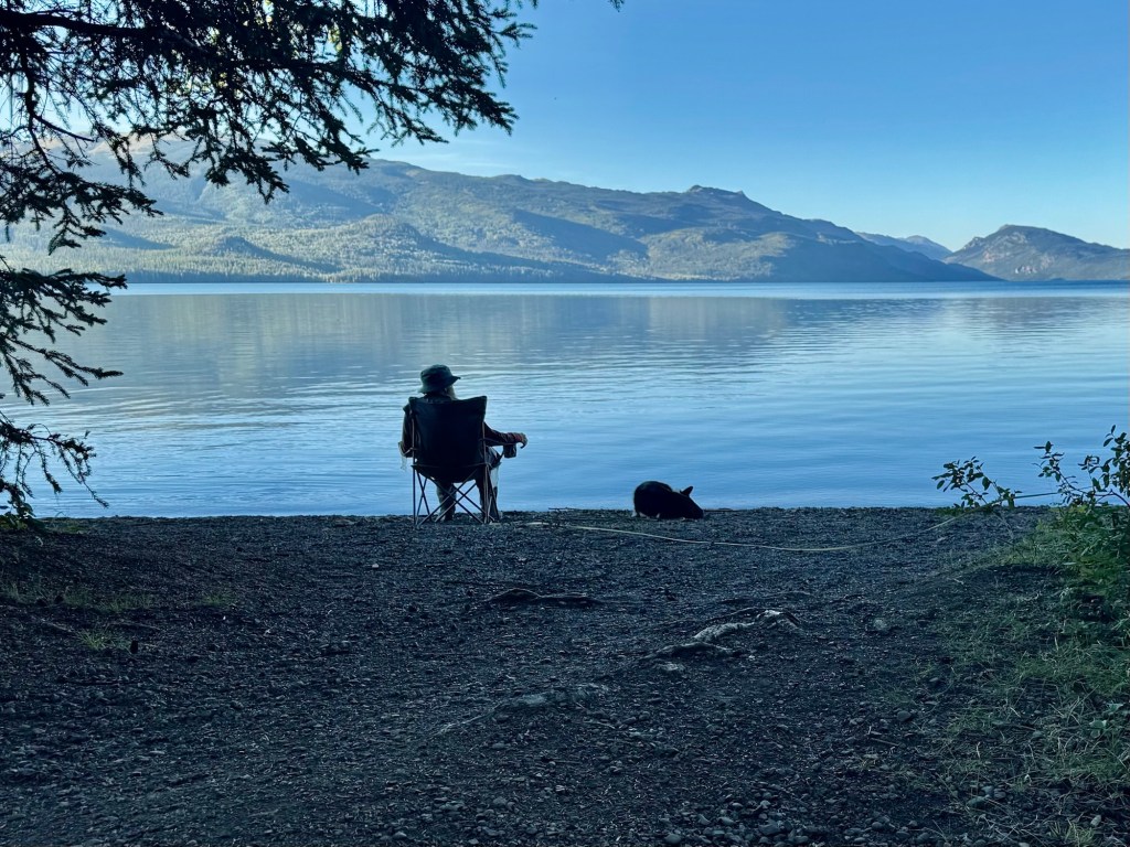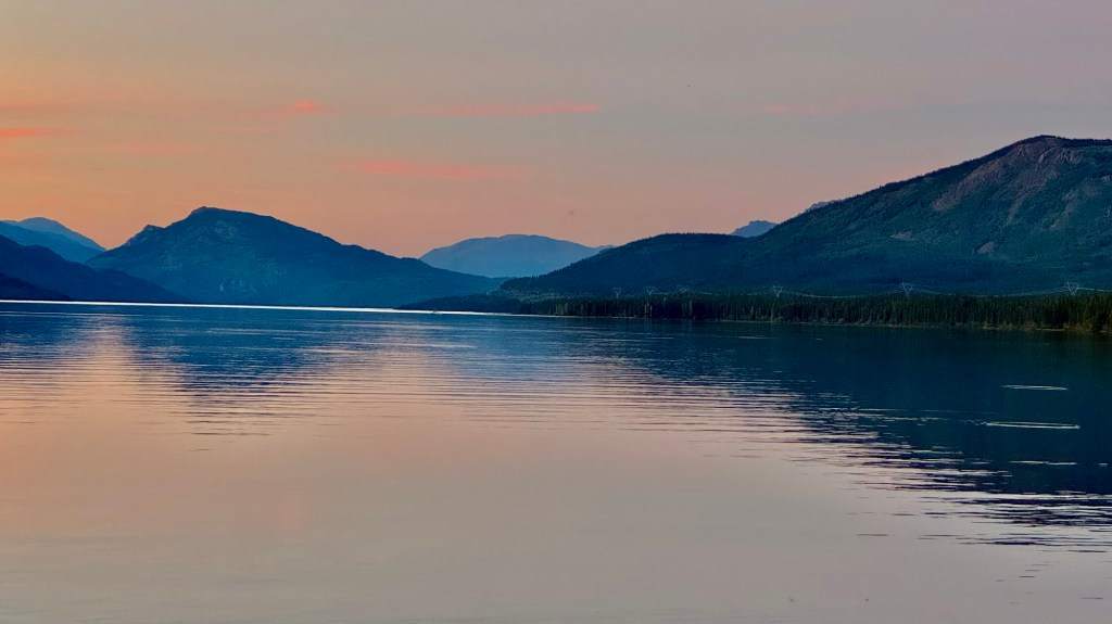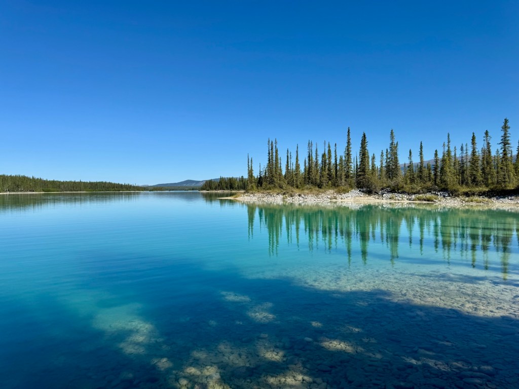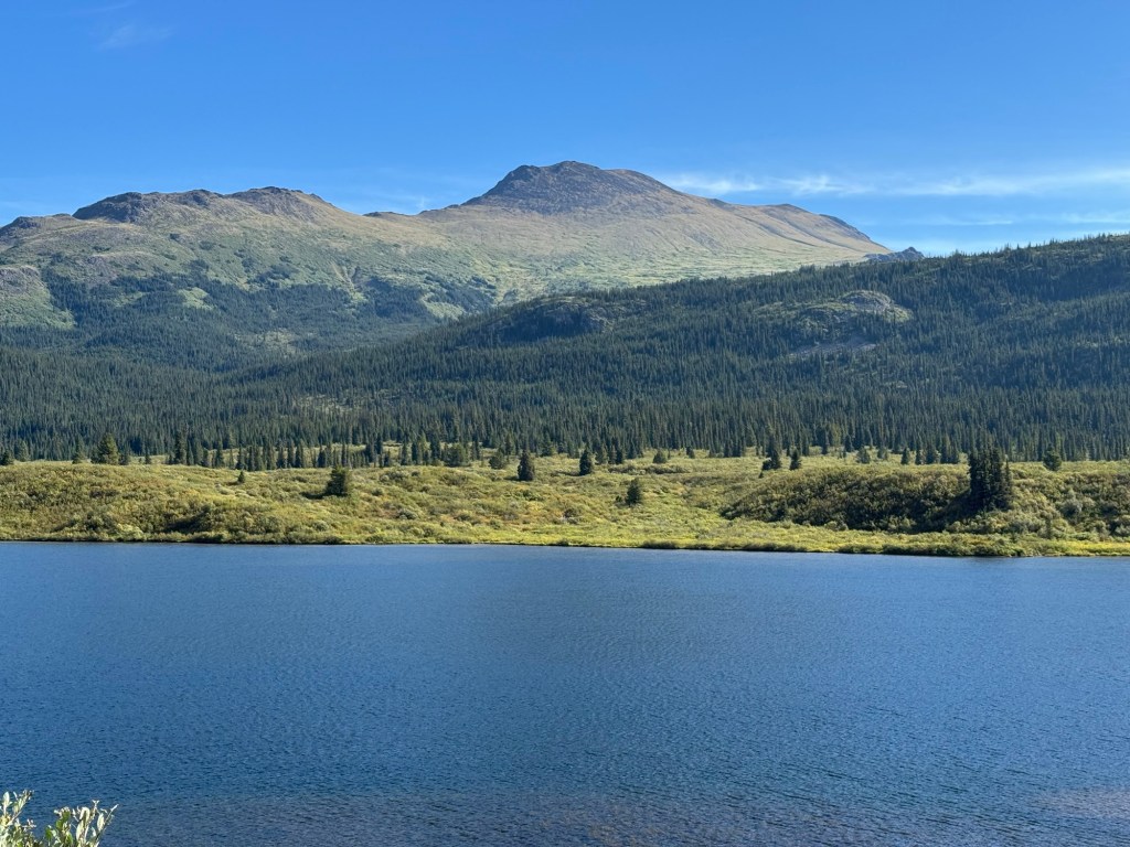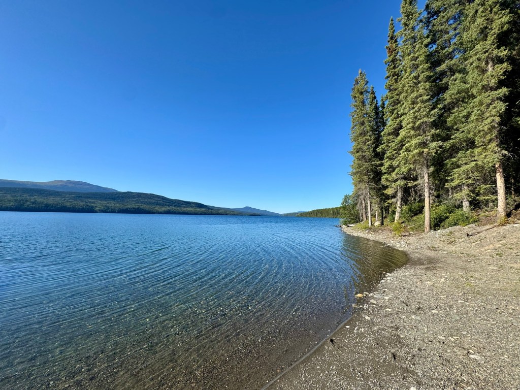 Der Weg zurück, auf den begeben wir uns nun endgültig, führt zuerst einmal wieder auf dem Alaska Highway nach gegen Osten. Schon bald sind wir wieder am uns bekannten Tesslin Lake und dank dem warmen Wetter können wir bei schönster Aussicht vor dem geschlossenen Visitorcenter einen Imbiss zu uns nehmen.