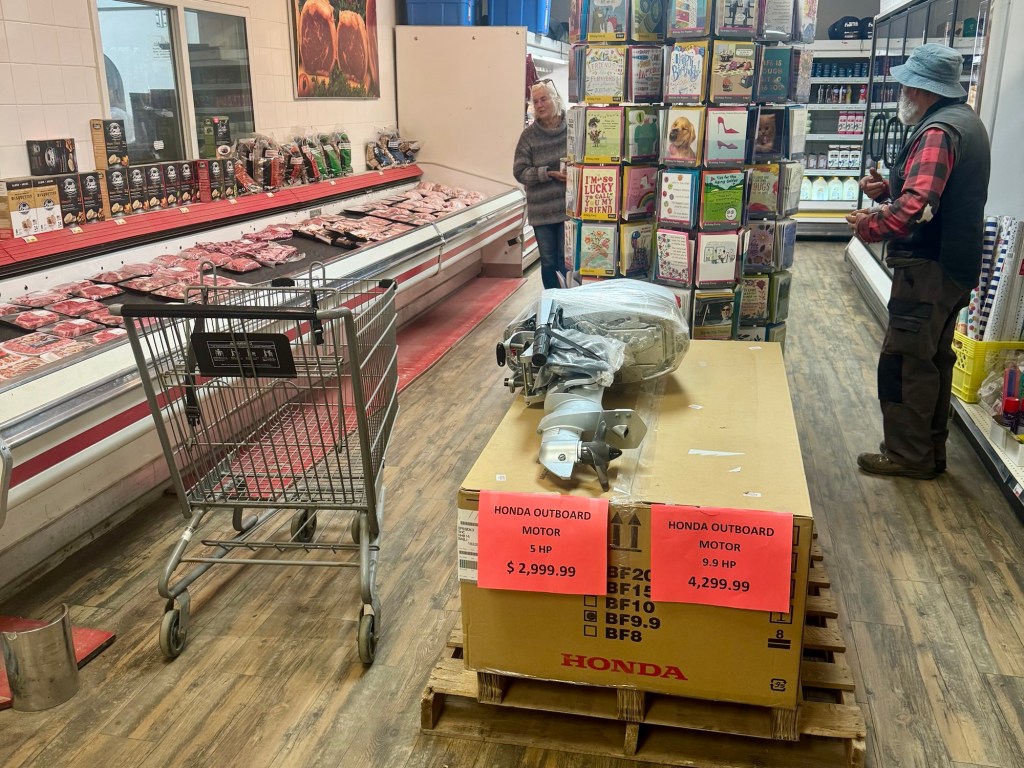 Nun die Gegend ist nicht sehr dicht besiedelt und die Generalstores zumindest so general, dass neben der Fleischauslage auch gleich noch der Aussenbordmotor angeboten wird.