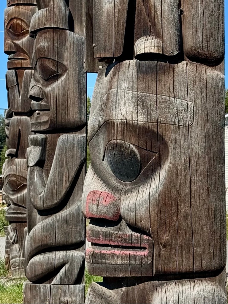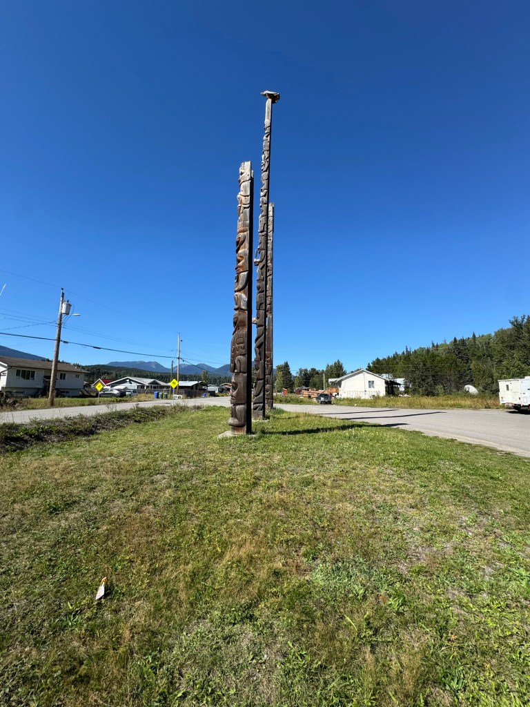 Schon bald erreichen wir den Ort Kitwanga bzw. davor den First Nations Ort Gitanyow mit den hohen Totempfählen.